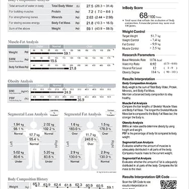 Ce test précis mesure la composition corporelle (masse musculaire, masse grasse, eau corporelle) pour un suivi personnalisé de votre santé et de vos objectifs.